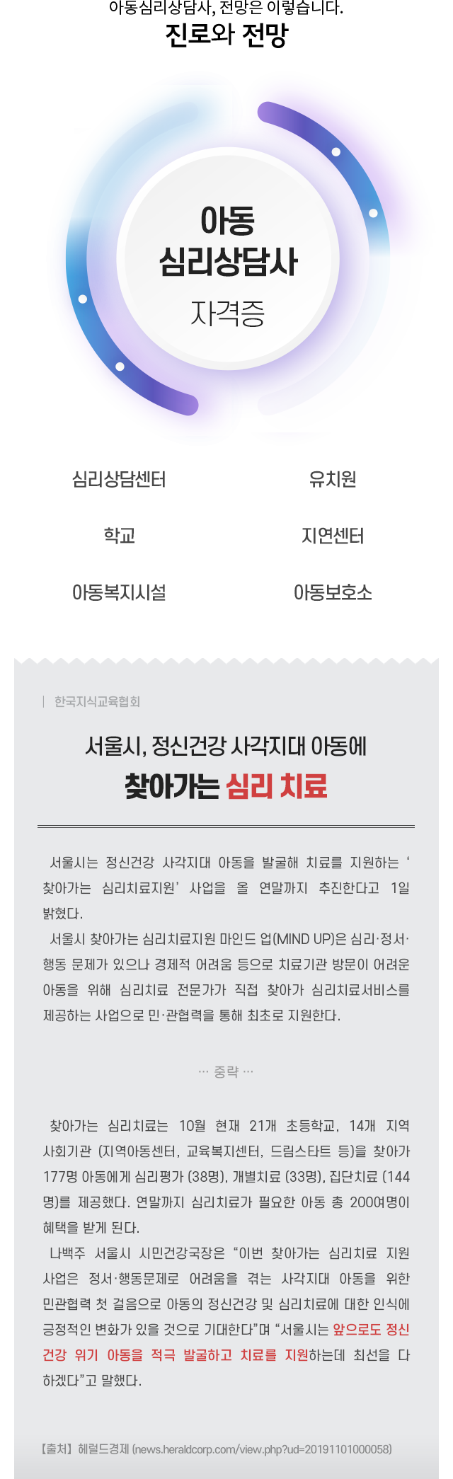 • ¾Æµ¿½É¸®»ó´ã»ç Ȱµ¿À» À§ÇÑ ÀÚ°ÝÃëµæ°úÁ¤À» ÅëÇØ »ó´ãÀ̷аú Áö½ÄÀ» ½ÀµæÇϰí,°¢ ¹®Á¦À¯Çüº° ¾Æµ¿¹ß´ÞÀÇ ¿ø¸®¿Í ´Ù¾çÇÑ ±â¹ýÀÇ È°¿ë¹æ¹ýÀ» üµæ½ÃÄÑ ¾Æµ¿½É¸®»ó´ãÀڷμ­ÀÇ ±âÃÊÀûÀÎ Á÷¹«¼öÇà ´É·ÂÀ» ¹è¾çÇÏ´Â °ÍÀ» ¸ñÇ¥·Î ÇÕ´Ï´Ù.