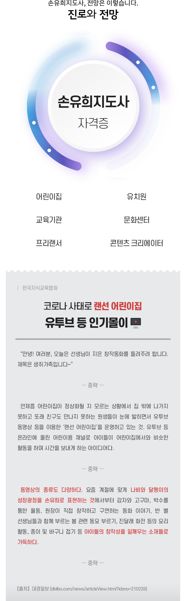 • ¼ÕÀ¯ÈñÁöµµ»ç Ȱµ¿À» À§ÇØ ³îÀÌÄ¡·á±³À°ÀÇ À̷аú Áö½ÄÀ» ½ÀµæÇϰí, ¾Æµ¿¿¡°Ô ¿©·¯ °¡Áö °³³ä Çü¼ºÀ» µµ¿Í ÀÎÁö ±â´ÉÀÇ ±âÃʸ¦ ´ÙÁú ¼ö ÀÖ´Â °úÁ¤À» ¹è¿ö ¼ÕÀ¯ÈñÁöµµ»ç·Î¼­ÀÇ ±âÃÊÀûÀÎ Á÷¹«¼öÇà ´É·ÂÀ» ¹è¾çÇÏ´Â °ÍÀ» ¸ñÇ¥·Î ÇÕ´Ï´Ù.