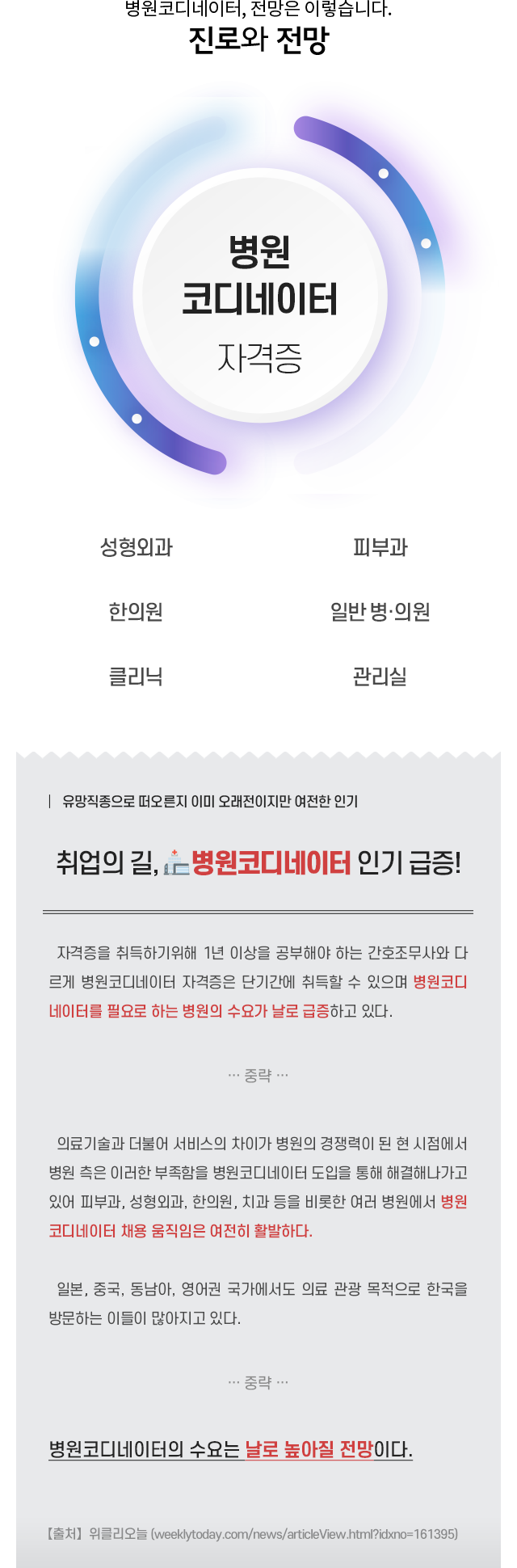• º´¿øÄÚµð³×ÀÌÅͶó´Â ÀÇ·á¼­ºñ½º Àü¹®°¡·Î¼­ÀÇ ±âº»ÀûÀÎ Á¤ÀÇ¿Í ¿ªÇÒ, Àü¹ÝÀûÀÎ ¾÷¹«, °í°´ ÀÀ´ë, °í°´ »ó´ã µî ½ÇÁ¦ ½Ç¹«¿¡ µµ¿òÀ» ÁÙ ¼ö ÀÖ´Â ÀÌ·ÐÀ» Á¦°øÇϸç, ÀÇ·áÁø°ú ȯÀÚ ¹× °í°´µé¿¡°Ô ¹àÀº À̹ÌÁö¸¦ ½É¾îÁÖ°í °Ç°­ÇÏ°í ¼º¼÷ÇÑ ÄÚµð³×ÀÌÅÍ·Î ¼ºÀåÇÒ ¼ö ÀÖµµ·Ï ÇÏ´Â °­Àǰ¡ ÀÌ·ç¾îÁý´Ï´Ù.
