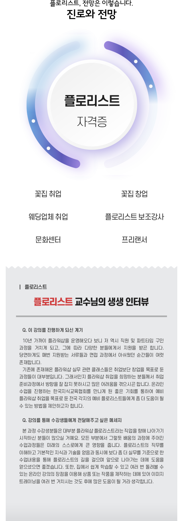 • ±âÁ¸¿¡ ÀÖ´ø Çöó¿ö¼¥ ½Ç¹« °ü·Ã Ŭ·¡½ºµéÀº Ãë¾÷º¸´Ü â¾÷À» ¸ñÇ¥·Î µÐ °úÁ¤µéÀÌ ´ëºÎºÐÀÌ´Ù. º» °úÁ¤ÀÇ ¸ñÇ¥´Â Çöó¿ö¼¥ Ãë¾÷À» ÁغñÇÏ´Â ¿¹ºñ Ç÷θ®½ºÆ®µé¿¡°Ô ÀûÀýÇÑ ¹æÇâÀ» Á¦½ÃÇØÁÖ´Â °ÍÀÌ´Ù. Á÷¹«¸¦ ÀÌÇØÇϰí È­ÈÑ °ü·Ã ±âº»ÀûÀÎ ¹ÙÅÁ Áö½ÄÀ» ¾òÀ» ¼ö ÀÖµµ·Ï ÇÔ°ú µ¿½Ã¿¡ Çöó¿ö¼¥ Ãë¾÷À» À§ÇÑ Áß¿ä Á¤º¸¸¦ ½Àµæ½ÃŲ´Ù.